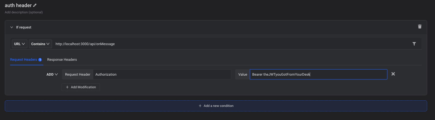 If you're working locally, the redirection of "onMessage" may delete the headers including the JWT. Don't be surprise if your intent/trigger don't work. You can fix it temporarily by using Requestly to add a header rule. The solution is to console.log the jwt given by your client and inject it when you call onMessage. Be aware that the JWT expire after 1h so you may need to change it multiple time